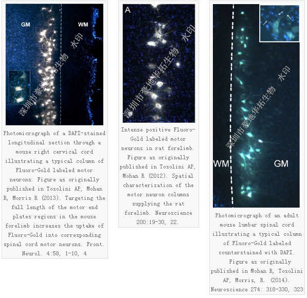 Fluoro-Gold can be dissolved in distilled water or 0.9% saline, or utilized as a suspension in 0.2M neutralphosphate buffer.